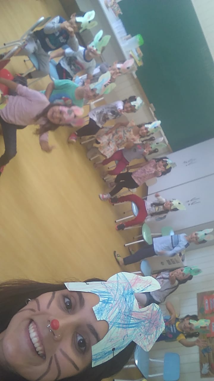 Assistimos um vídeo da Páscoa contado por crianças, e então alunos de algumas turmas foram a busca de seguir as pegadas do coelho pra encontrar, depois de alguns minutos o Coelho foi encontrado. Para a alegria de todos!!!